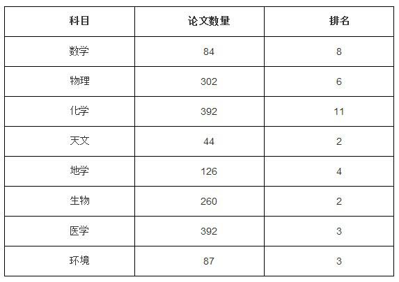 8、 据2007年度SCI收录论文统计,北京大学部分学科科技论文情况如下: