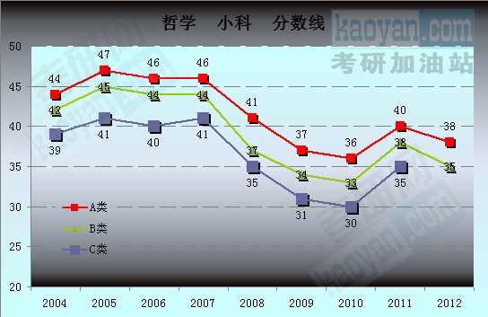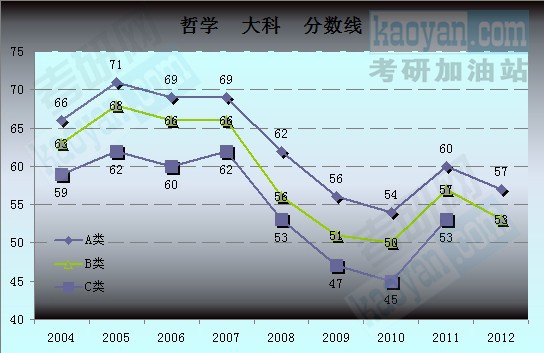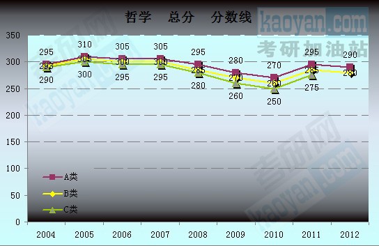 为让广大研友能更方便快捷地对比历年分数,考研网特汇总2004年至2012年哲学的国家复试分数线数据,制成下图,希望能更清晰直观的展示哲学历年的分数线走势。