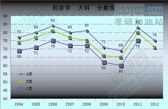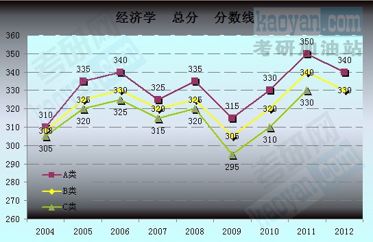 为让广大研友能更方便快捷地对比历年分数,考研网特汇总2004年至2012年经济学的国家复试分数线数据,制成下图,希望能更清晰直观的展示经济学历年的分数线走势。