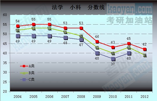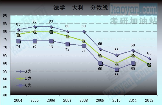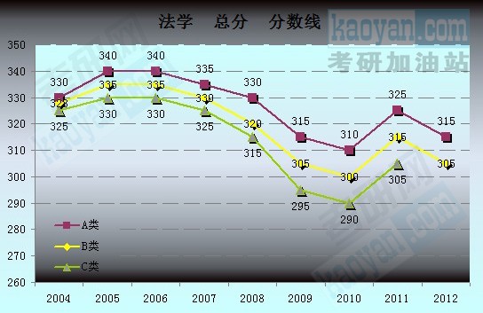 为让广大研友能更方便快捷地对比历年分数,考研网特汇总2004年至2012年法学学科的国家复试分数线数据,制成下图,希望能更清晰直观的展示法学学科历年的分数线走势。
