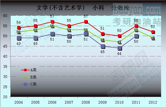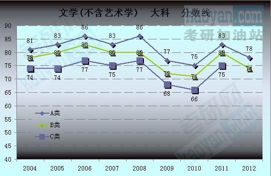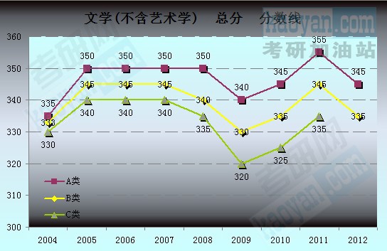 为让广大研友能更方便快捷地对比历年分数,考研网特汇总2004年至2012年文学(不含艺术学)的国家复试分数线数据,制成下图,希望能更清晰直观的展示文学(不含艺术学)历年的分数线走势。