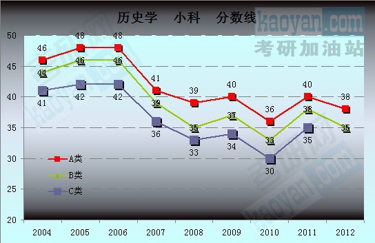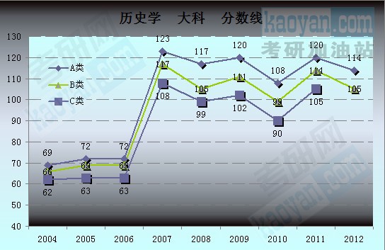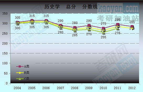 为让广大研友能更方便快捷地对比历年分数,考研网特汇总2004年至2012年历史学的国家复试分数线数据,制成下图,希望能更清晰直观的展示历史学历年的分数线走势。