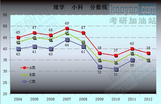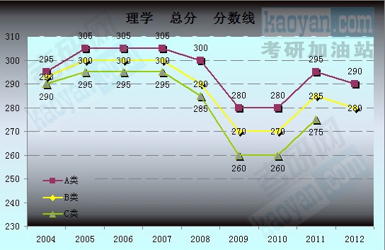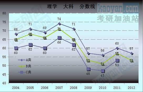 为让广大研友能更方便快捷地对比历年分数,考研网特汇总2004年至2012年理学学科的国家复试分数线数据,制成下图,希望能更清晰直观的展示理学学科历年的分数线走势。