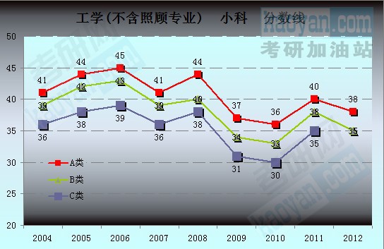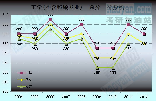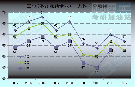 为让广大研友能更方便快捷地对比历年分数,考研网特汇总2004年至2012年工学(不含照顾专业)的国家复试分数线数据,制成下图,希望能更清晰直观的展示工学(不含照顾专业)历年的分数线走势。