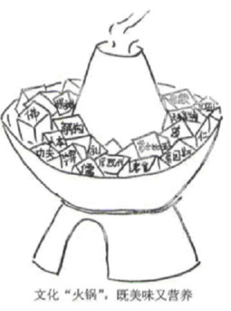 As is vividly depicted in the drawing, in the middle of the cartoon stands a hot pot, containing many Chinese cultural symbols, such as Beijing operas, Daoism, and some foreigh cultural symbols, etc. How impressive the drawing is in describing the common phenomenon that Chinese culture is becoming increasingly integrated into the world. The drawer’s intention seems to be highly self-evident and the meaning causes us to be thought-provoking。