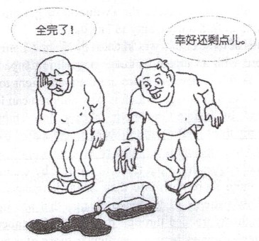 这幅漫画象征性的描述了一个倒在地上的瓶子,一些牛奶洒了出来。在这个瓶子的旁边站着两个人,一个垂头丧气的说“全完了!”,而另一个则说“幸好还剩点儿!”。这幅画所表达的内容既意义深远又发人深省。