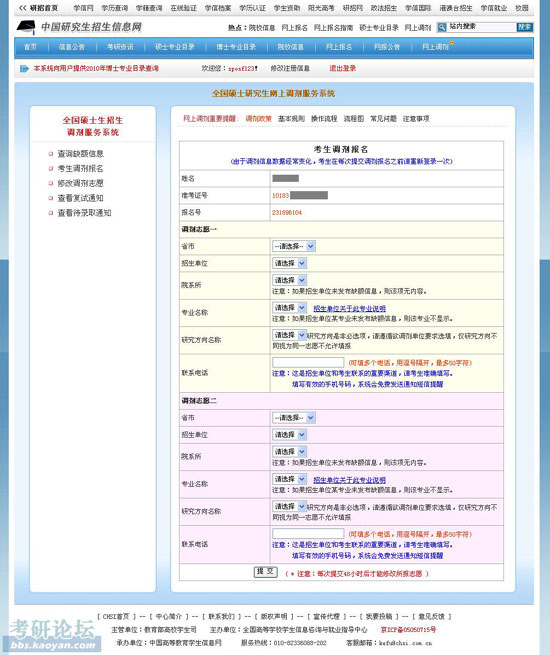 6. 你找到了合适的缺额信息,那么接下来就要填写调剂志愿了,点击【调剂考生报名】。你会看到报名表有《调剂志愿一》和《调剂志愿二》上下两个部分组成,这意味着你能够同时向两所院校填写调剂申请。根据研招网的说明,尽管上面写“志愿一”和“志愿二”,它们仅仅只是个编号,不代表你调剂意愿的优先级。另外,必须指出的是,你填写的两个志愿都能被你调剂的院校看到,比如你同时申请调剂A和B两所院校,那么A院校除了能够看到你申请A校的志愿,也能看到你申请B校,有的调剂院校不愿考生兼报其他志愿,所以选择要慎重,最后打电话询问对方研招办再填写。如下图5: