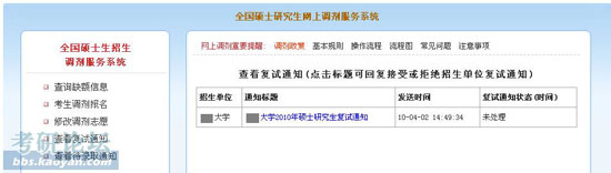 (3)如果你的状态时“已发复试通知”,那么说明你调剂已经申请成功,你可以点左栏的【查看复试通知】,如下图10: