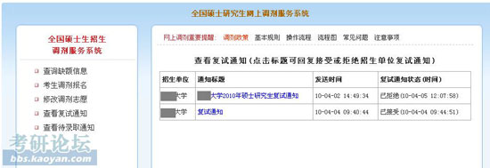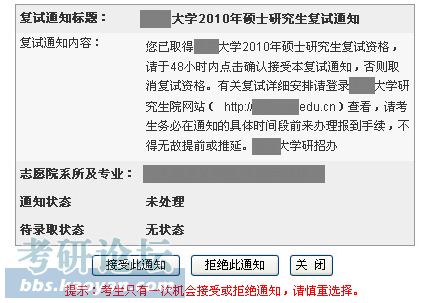 如果你确定要参加该院校的复试,就点【接受此通知】,否则,就点【拒绝此通知】。有些考生还要等其他院校的通知,不做任何操作,过几天研招办会来电催你确认或拒绝,或是可能直接取消对你的通知,所以要自己做个取舍。如下图11: