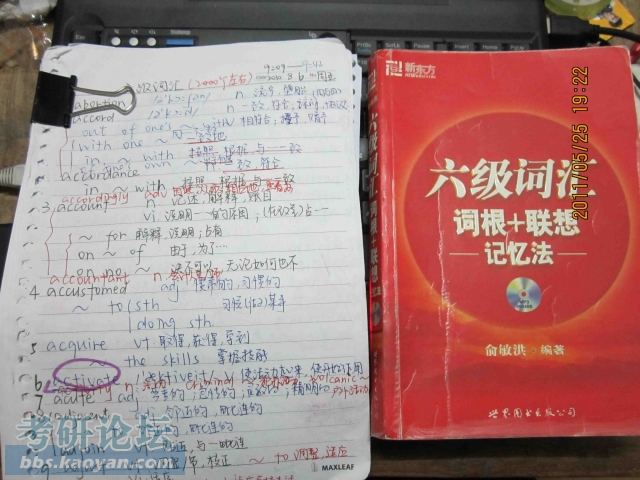 在网上买了刘一男的5500个词汇,自己整理的笔记(有网友问我说词汇是不是2500个,当然不是,是我自己标的记号,觉得词根是这么多,词根又衍生出很多单词,当然还是要背诵红宝书5500个)