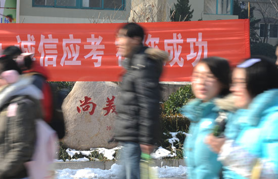 青岛市21个考点共有17413名考生参加考试,尽管今天岛城天气晴朗,但最低温仍达到-9℃。寒冷的天气依然抵挡不住考生的热情,为了抵挡严寒,考生们都穿戴严实,贴着暖宝宝,拿着热水杯,在考场内搏战。