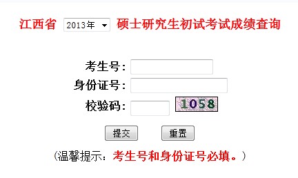 江西省2013年全国硕士研究生入学考试初试成绩查询已开通,点击下图进入查询页面。