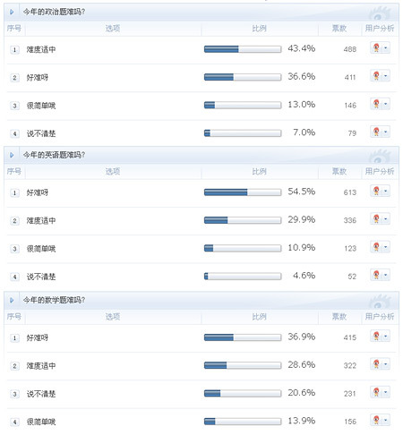 “2012年考研难度调查”的调查中,对于政治科目,43.4%的网友表示难度适中,36.6%网友表示好难,觉得很容易的网友有13.0%。对于英语科目,超过五成网友感叹好难,占所有受调查考生的54.6%,29.8%的网友表示难度适中,只有10.8%的网友表示很简单。