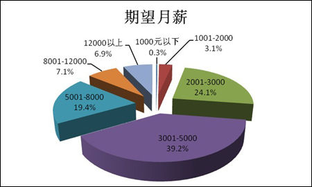 本次参与调查的人群期望月薪主要集中分布在3000~5000元范围内,并且,期望月薪随着学历的增高而增高,其中,专科生期望月薪接近3000元;本科生期望月薪为3500元;硕士生接近5000元;博士生超过7000元。