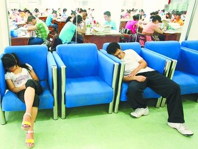 昨天上午,学校图书馆自习室内大部分座位已经坐满,门口有两名学生因为前晚排队占座没有休息好,在椅子上小憩。记者杨涛 摄