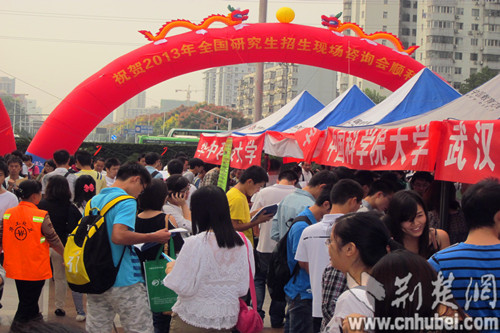 荆楚网消息(记者彭烨炜、实习生胡亚妮)9月22日,2013年全国研究生招生现场咨询会(武汉站)在华中科技大学举行,全国近七十所优秀高校汇聚武汉,前往咨询的考生及家长累计近万人。