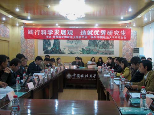 11月11日上午,首都研究生学习与践行科学发展观研讨会在中国政法大学学院路校区内举行。此次研讨会由共青团中国政法大学委员会主办,中国政法大学研究生会承办。来自在中国政法大学、中国人民大学、北京理工大学、北京师范大学、首都对外经贸大学、中央民族大学等近二十所高校研究生代表齐聚一堂,围绕“践行科学发展观,造就优秀研究生”这一主题进行了交流与探讨。中国政法大学马克思主义学院副院长孙美堂教授、中国政法大学校团委邱文栋老师、北京市学生联合会执行主席刘珺应邀出席了本次研讨会。