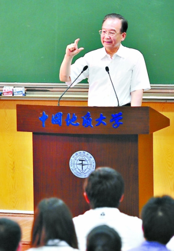 19日晚,国务院总理温家宝回到自己的母校——中国地质大学(武汉)看望师生,参观了国家重点实验室后,他在该校作了长达50分钟的即兴演讲。