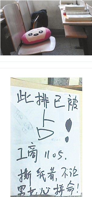 网友“穿不进线的针”小崔也向记者诉苦:“这哪是占座,分明是打仗。”他说,他是华农的学生,也是占座大军的一员,上周他占座的书都不见了,听说有同学半夜就起床排队了。他决心改天带上胶布,把占座的书牢牢粘在课桌上。