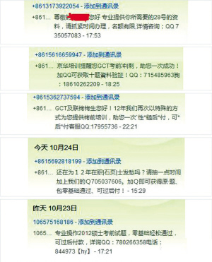 她特意保存了几条,内容如下:“专业提供你所需要的28号的资料,请抓紧时间办理,名额有限。”“XX培训提醒您GCT考前冲刺,助您一次成功!加QQ可获取十题资料验证!”“还在为12年在职硕士发愁吗?请抽一点时间加上我们的QQ,加QQ即可获得原题、包零基础通过,可过后付。”“专业操作2012硕士考前试题,零基础轻松通过,可过后付款。”