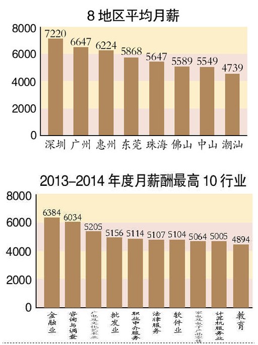 一份覆盖34个行业318个职位的《2013~2014年度广东地区薪酬调查报告》最近发布,记者昨日从中对比发现,2013年平均月薪前三位为深圳、广州、惠州。金融业、咨询和调查、广电及文化艺术业是平均月薪最高的前三位。不同学历间薪酬水平的差距有所缩小,硕士取代本科成“高薪砝码”。