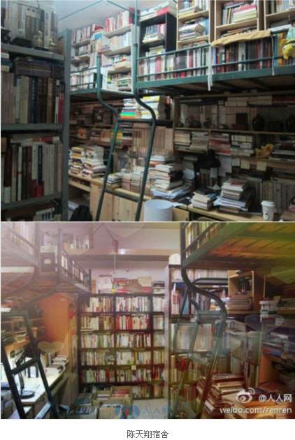 陈天翔说,在网上热传的照片中,其实是可以睡觉的。“其他床铺上堆满了书,但在铁架子后边的那个床铺上,只沿床边放了一排书,床上有一米宽,有时候看书看累了,就直接在这里睡,但是翻身比较困难。”