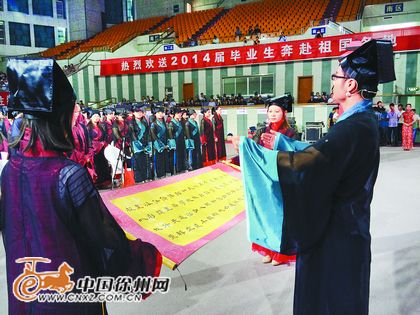 6月20日上午9时,江苏师范大学体育馆内,独具汉风汉韵的2014届硕士生汉服毕业典礼,在三声金锣、三声礼号齐鸣后,在恢弘大气的汉乐中拉开了帷幕。江苏师范大学已是连续第三年举行硕士生汉服毕业典礼。