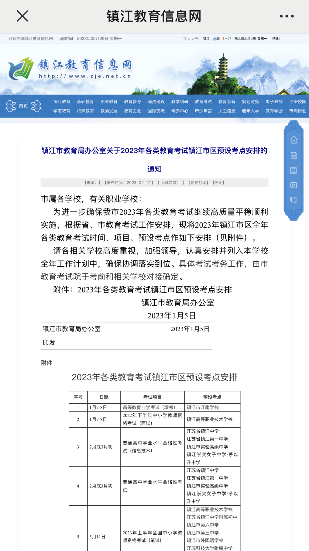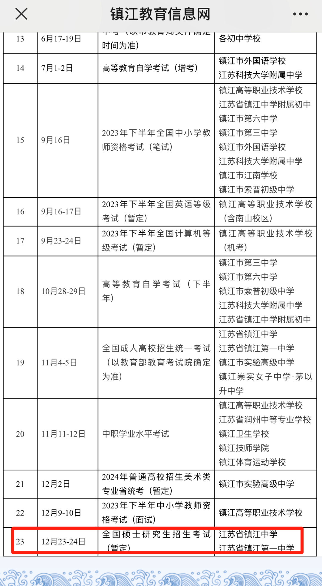 大家知道前几年考研初试时间都是24、25、26左右!但江苏省镇江市教育局办公室今年发布了关于2023年各类教育考试镇江市区预设考点安排的通知,其中全国硕士研究生招生考试(暂定)在12月23-24日。
