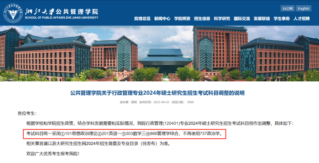 这个一定要仔细看!有些院校的专业估计有所修改或者取消招生。像浙江大学公共管理学院发布过公告,其行政管理(120401)专业调整24考研初试科目!其专业课改为303数学三,不再使用737政治学。