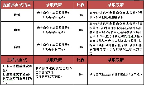 第三,为进一步选拔工作经验丰富,具备较强实战能力的考生,通过提前面试获得优秀、良好成绩的考生预录取资格保留2年(只针对第一志愿报考我校的考生)。若第二年国家招生政策有变化,则预录取资格保留考生的录取政策做相应调整;