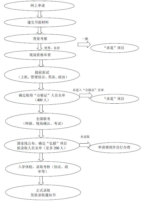 实施传统的招生选拔方式,采取“网上报名、现场确认、全国联考、学校统一划线、综合复试、择优录取”的方式进行。未参加“弘毅”项目提前面试或者参加了提前面试但未能获得“合格证”的考生,均可报考“求是”项目。